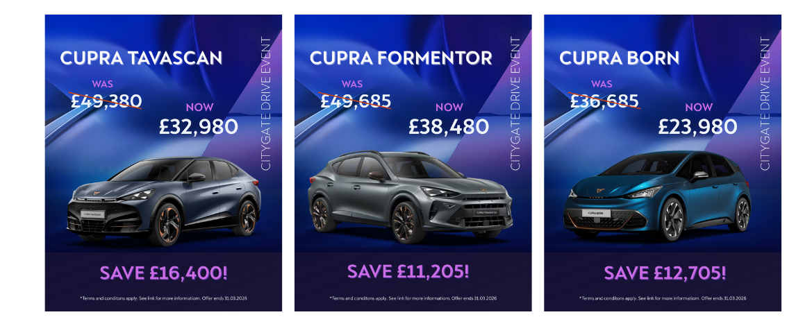 At Citygate, we’re offering exclusive cash savings across the CUPRA range this March. From striking design to electrified performance, we are offering up to £16,000 off!